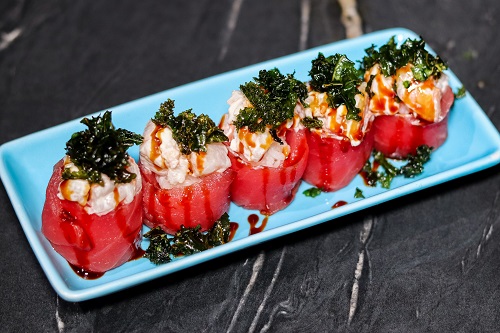 Fresh tuna, rice, topped with creamy prawn and crispy kale0