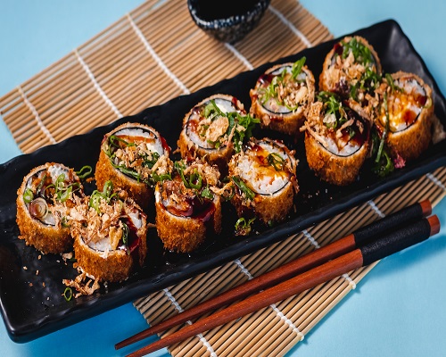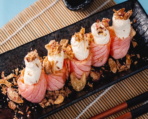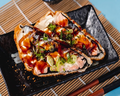 Rice, salmon, cream cheese, teriyaki topped with crispy onion.0