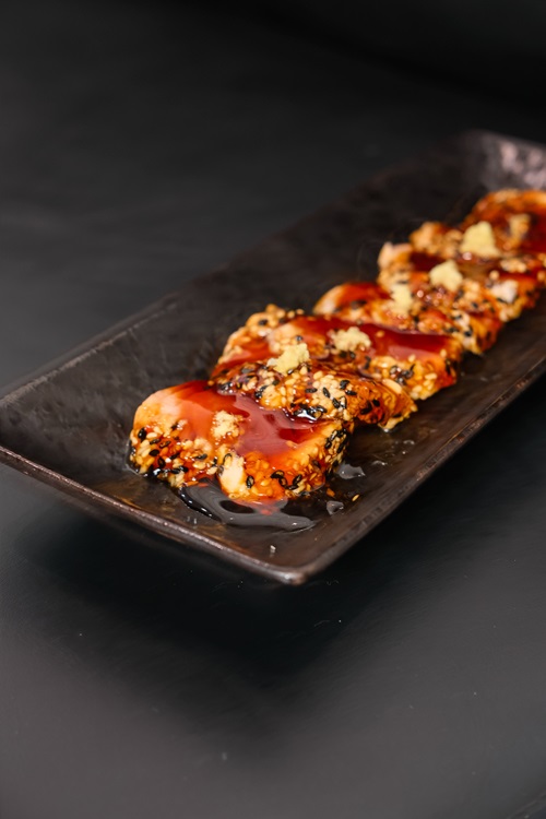 Salmon Tataki$18.50110 grams of Sealed salmon covered in sesame seeds. Topped with Teriyaki sauce and ginger zest.