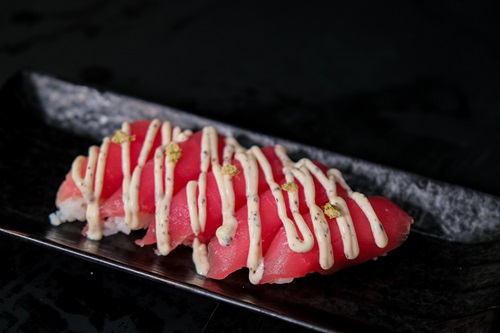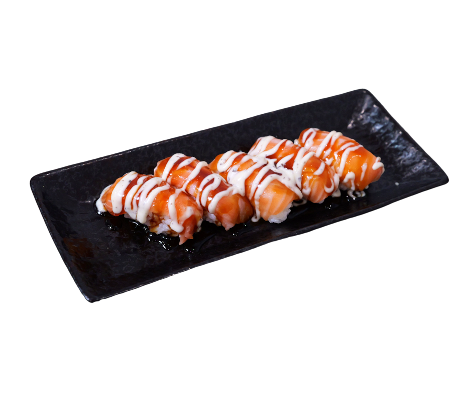 5 pcs of salmon nigiri topped with truffle infused mayo and teriyaki.0